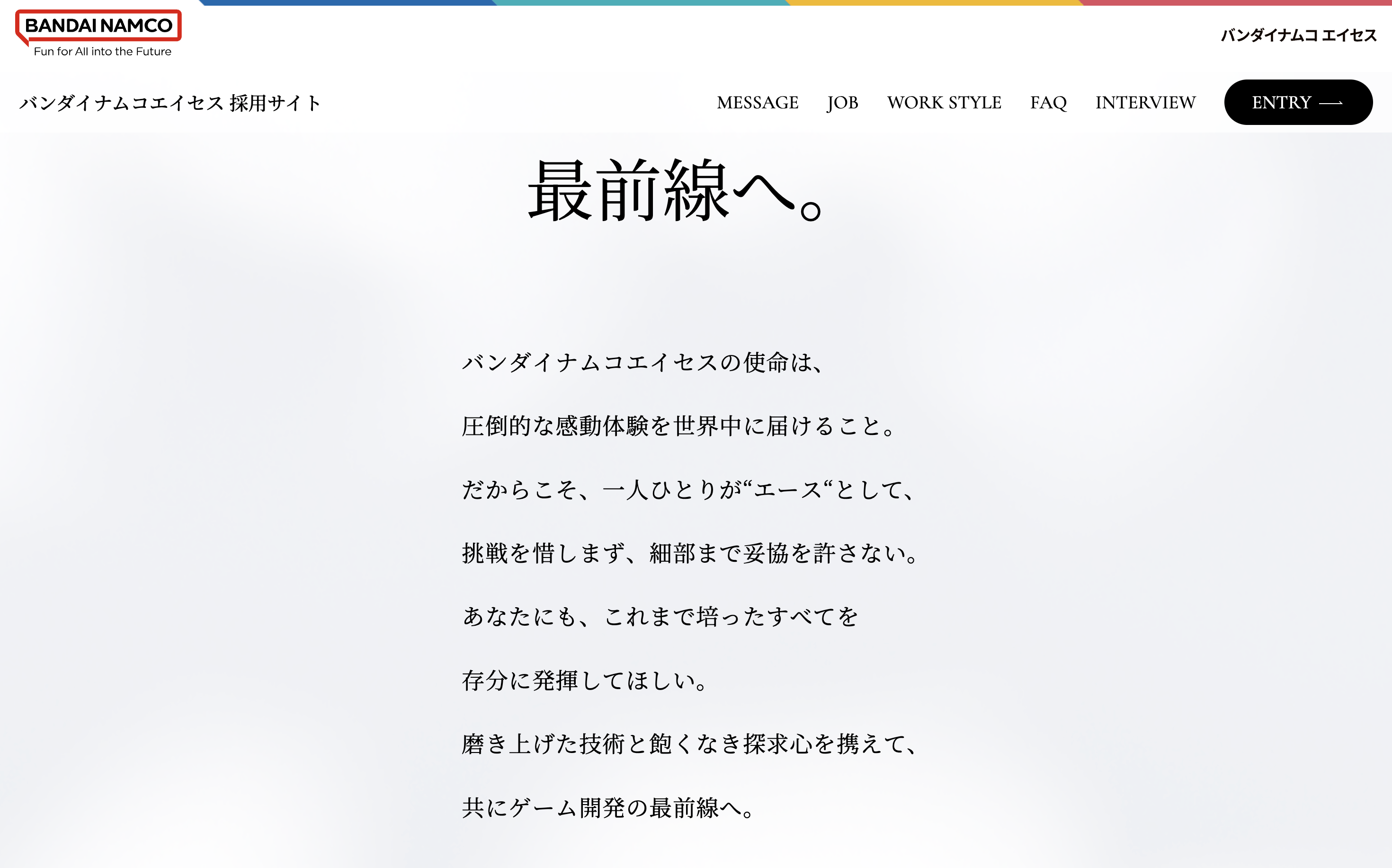 採用サイトにおいては、このコンセプトを求職者向けに「最前線へ。」というコンセプトで再解釈。従来的な採用コミュニケーションとは一線を画し、レベルの高い開発環境でゲームづくりに打ち込む覚悟を問うようなメッセージに仕立てることで、ターゲットにアプローチしました。