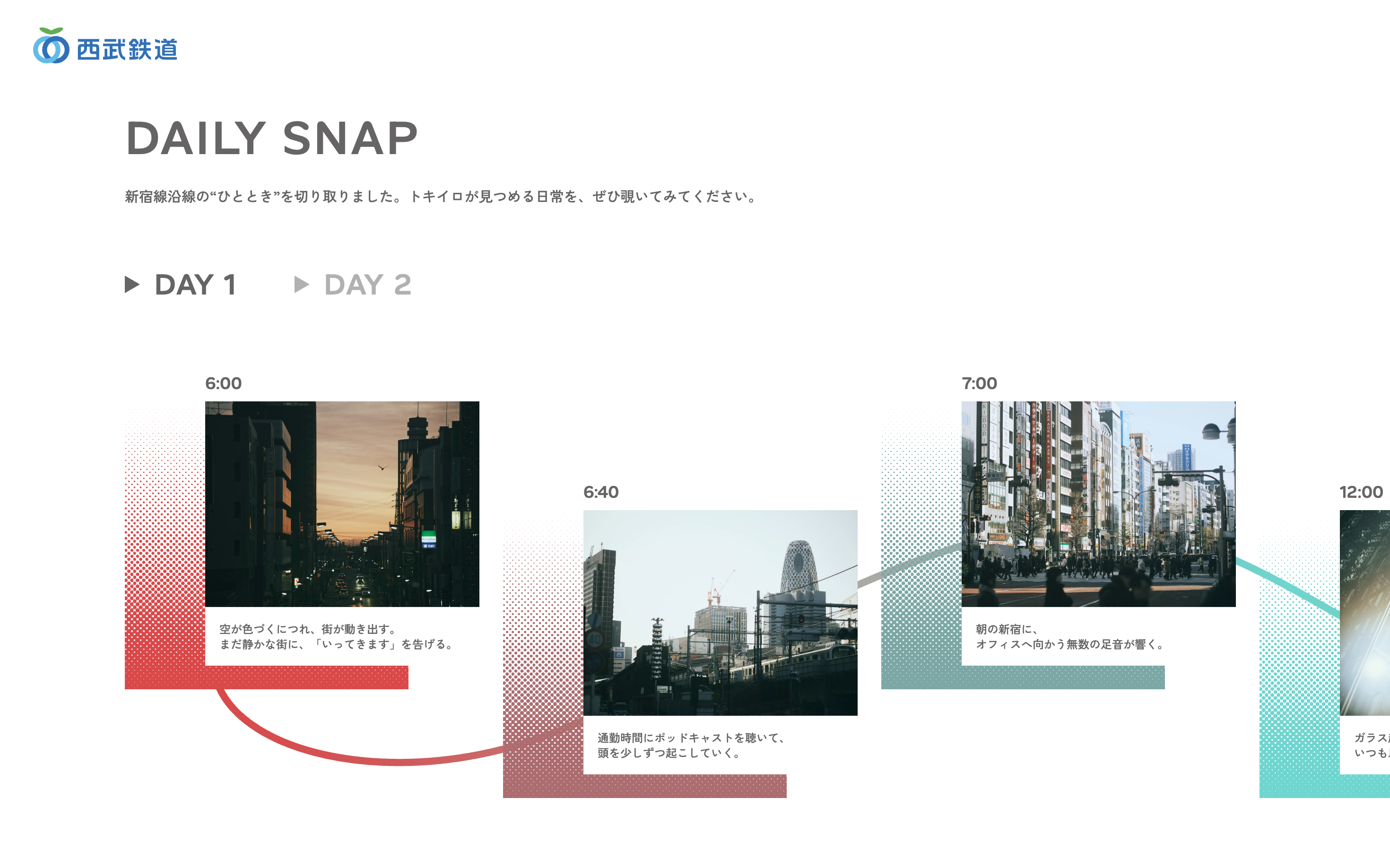情報リリース当日には特設サイトへと切り替える形で公開。愛称やロゴ、車両デザインに込められた想いが分かりやすく伝わるよう設計しました。また、沿線の日常を空の写真とともに切り取った「DAILY SNAP」などのコンテンツにより、トキイロがもたらす豊かさの質感が感じられるサイトに仕上げました。