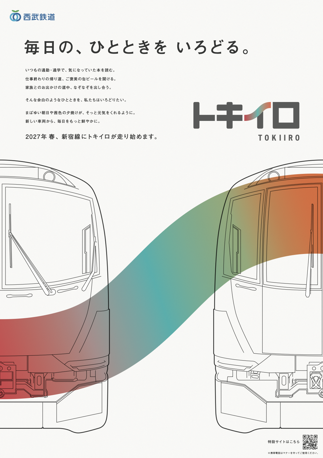 トキイロの車両側面にデザインされたグラデーションの「エナジーウェーブ」は、朝から昼へ、昼から夕方へ移り変わる空の色をイメージしています。トキイロという愛称も「時の色」を意味しており、沿線の日常を豊かにする存在になっていきたいという想いが込められています。
