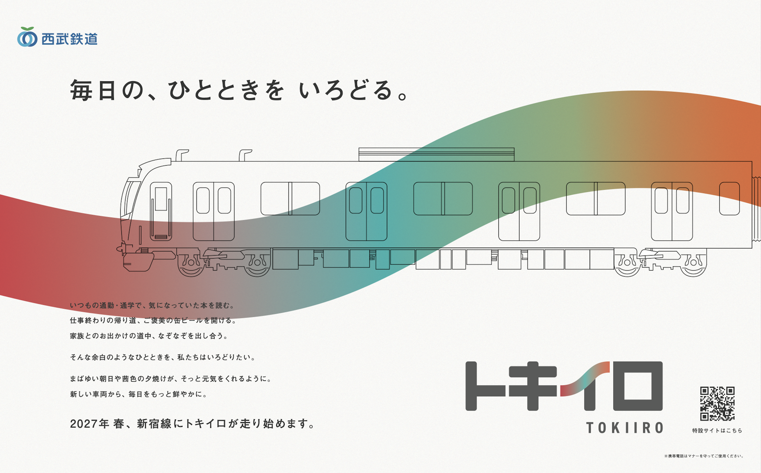 2027年春、運行開始予定の新車両「トキイロ」。株式会社丹青社が全体コンセプトを構築し、車両デザインやロゴ、PR戦略の策定など、アイデンティティ構築をトータルに設計。毎日の通勤・通学からおでかけまで、さまざまなシーンで心地よい移動時間を実現する、細部にまで配慮した設計が特徴です。